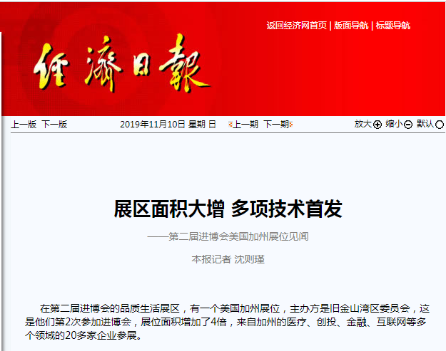 经济日报:展区面积大增 多项手艺首发 ——第二届进博会美国加州展位见闻